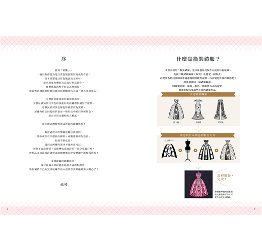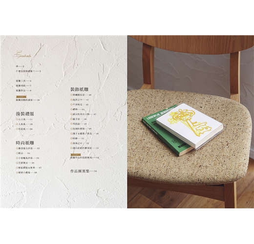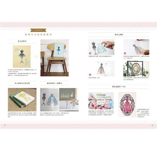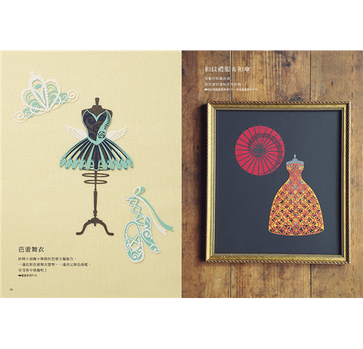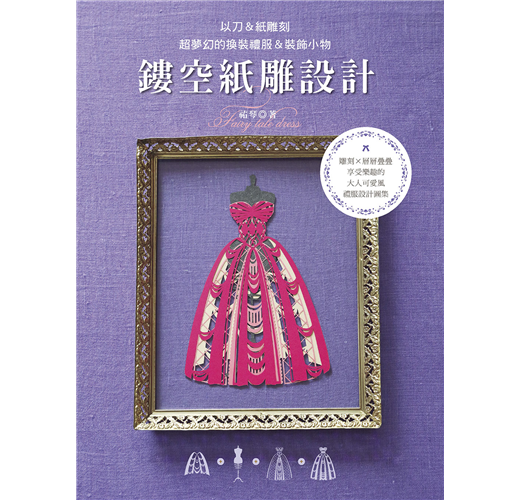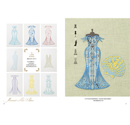 本書以「換裝禮服」為主題,提供了公主風‧人魚風‧宮庭風,三種夢幻禮服的輪廓,每一個風格輪廓又各自有不同花樣設計的組件,可藉由層疊搭配創造出層次性,並表現出不同於單純以一張紙進行細工雕刻時的立體感。若再加上色彩&紙張的變化,就能創作出無數套美麗迷人的禮服紙雕。