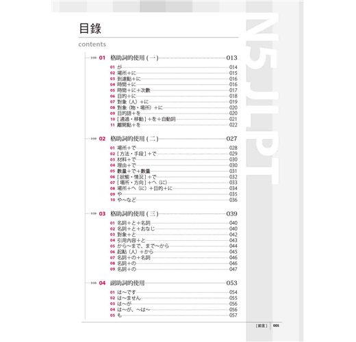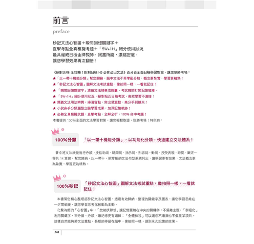因此,書中將所有符合N5文法程度的5個W跟1個H等使用狀況細分出來,並列出相對應的例句,讓您看到考題,答案立即選出!