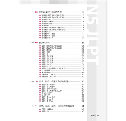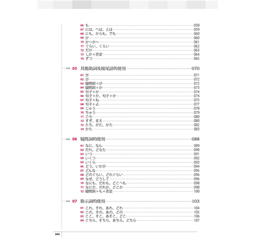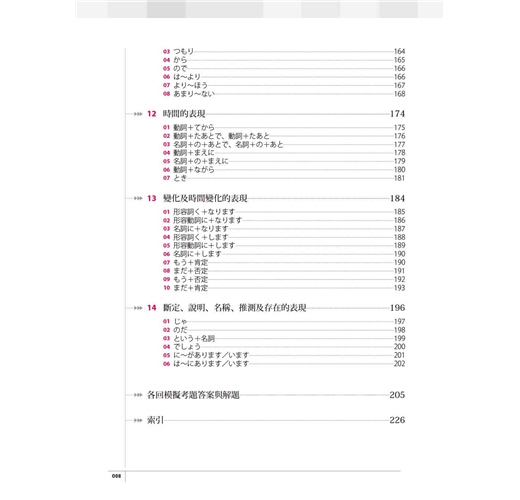 書中將文法機能進行分類,按格助詞、疑問詞、指示詞、形容詞、動詞、授受表現、時間、斷定…等共14章節,幫您歸納,以一帶十,把零散的文法句型系統列出,讓學習更有效果,文法概念更為紮實,學習更為精熟。