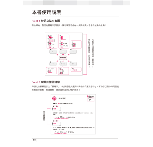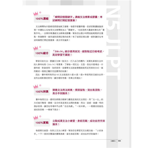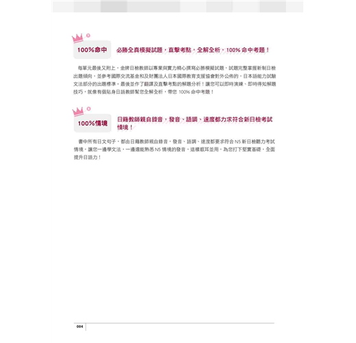書中每項文法,還特別將難分難解刁鑽易混淆的文法項目,用「比一比」的方式進行整理、歸類,並分析易混淆文法間的意義、用法、語感、接續…等的微妙差異。讓您在考場中不必再「左右為難」「一知半解」,一看題目就能迅速找到答案,一舉拿下高分!