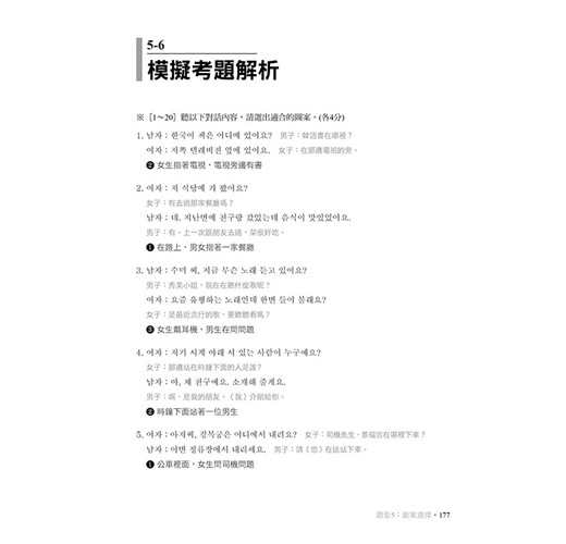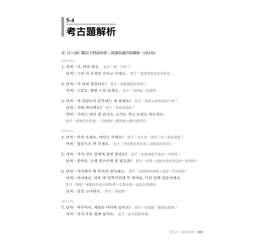 這個題型的內容多是生活中常使用的句子。如問候、詢問國籍或年紀、平常的習慣等,所以不需要分析太多文法,只要把平常基本對話中延伸的單字和句型記住,並多練習,就能從容作答。