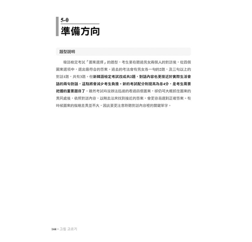 本書依新韓檢官方公布之考題,歸納出「回答」、「對話完成」、「場所 / 地點」、「短文主題選擇」、「圖案選擇」、「內容一致」、「一題兩答」等七大必考題型,提供考生每種題型的準備方向及應答技巧,讓考生準備考試不慌亂!