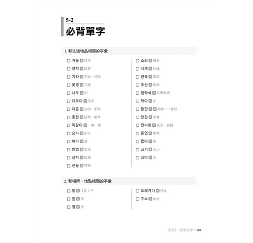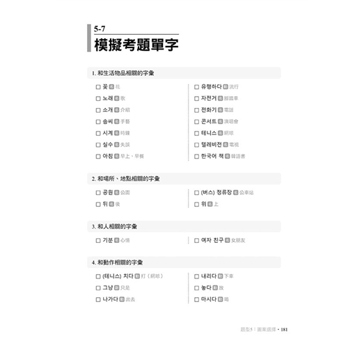 整理出該題型必考之相關單字,並依單字類型區分為「生活物品」、「飲食」、「場所 / 地點」、「動作」、「時間」、「人」等等,將必考單字完美系統化,一目了然好記憶。