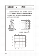 本書題目類型多樣化,獨特的遊戲設定和角色插畫趣味性十足,一算就上癮。動腦範圍涵蓋四則運算遊戲、圖案搜尋、心算挑戰、數字金字塔、圖畫測驗、數謎和數獨……越後面的遊戲難度越高!每一道遊戲都可以寫上解題時間,檢視自己的作答時間是不是夠快。是時候腦力全開了!