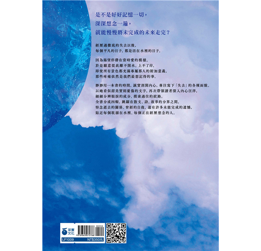 在水裡的日子,意謂著曾有個人讓你見過岸上的陽光燦爛。你嚮往什麼呢?在確信自己想要的生活景色之前,也許我們都還得輪迴個幾次。折射的,是回憶,亦或幻影。想念,是氧,還是窒息。如果你現在也在水裡,那這本書與你一起。──劉定騫(作家)