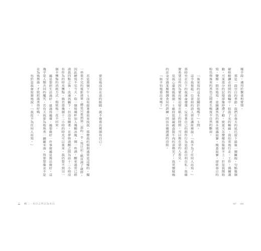 曾經期待這本書能有別於過去,扮演人生道路上的轉折,一個跌倒站起來敷藥而後痊癒的過程,嘆一口長長的氣說終於,終於能在孤獨的汪洋裡學會不失溫的方法,並為長年在濃霧裡動彈不得的自己指出逃離的方向,甚至能溫暖地回應...