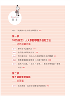 前言 改變我一生的語言學習法 第一部 100%有效、人人都能學會外語的方法─—迷思與觀念篇 ch1 學外語不必靠天分 ch2 我們過去都用錯方法 ch3 用科學方法,找出人人都能學會外語的關鍵 ch4 地表最強語言習得法:小孩子的方法 ch5 自然「沉浸」,自己「習得」!像孩子學母語一樣學外語 第二部 學外語就像學母語—─方法篇 ch6 走出教室,沉浸在社會型外語環境 ch7 沉浸式祕笈一:拋開大人的學習模式 ch8 沉浸式祕笈二:建造有愛環境之住宿篇 ch9 沉浸式祕笈三:建造有愛環境之社交篇 ch10 國外沉浸式實例:寒暑假出國沉浸式,取代貴又沒效的語言學校 ch11 國外沉浸式實例:光是出國還不夠!留學生如何沉浸式學好英文 ch12 國外沉浸式實例:不只是打工度假!找到賺錢與學外語的平衡點 ch13 台灣沉浸式實例:哪裡有外國人、外語環境,就往哪兒去 ch14 沉浸式習得人際關係:如何跟外國人做朋友、聊得來 ch15 不懂文法也學得會 ch16 不愛背單字,也能提升字彙量 ch17 「略讀」勝於「精讀」 ch18 我就是害羞、我就是不會建立環境,該怎麼辦? 第三部 學外語就像學母語—─實踐篇 ch19 平常忙工作,又想進修外語:上班族一週沉浸式計畫書 ch20 如果你有長假:菲律賓沉浸式英語停看聽 ch21 準備考試檢定:認清語言檢定的本質 ch22 也想當多語達人:大腦沒有語言數量的限制 ch23 教外國人中文:沉浸式華語教學 ch24 遇上傳統語言教與學困境:沉浸式找回學習本能 結語 迎接人人說多語的黃金時代