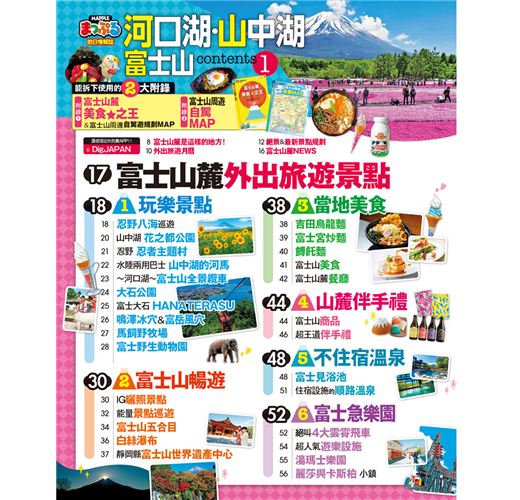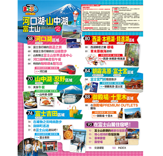 富士山麓是日本代表性的觀光勝地兼知名度假區,本書以富士山為中心把周邊分成6個區域,分別是「河口湖區域」、「山中湖和忍野區域」、「富士吉田區域」、「西湖‧本栖湖‧精進湖區域」、「朝霧高原、富士宮」、「御殿場、十里木區域」區域,並依照旅遊目的細心介紹各大景點和活動,請根據自己的喜好安排行程吧!