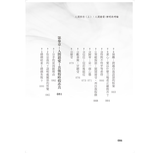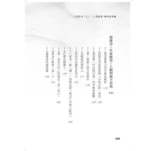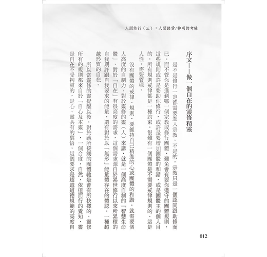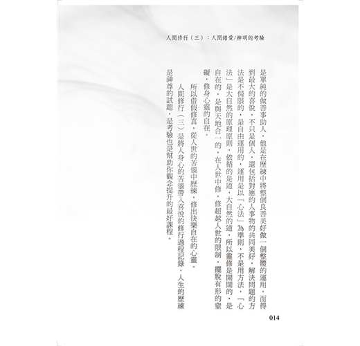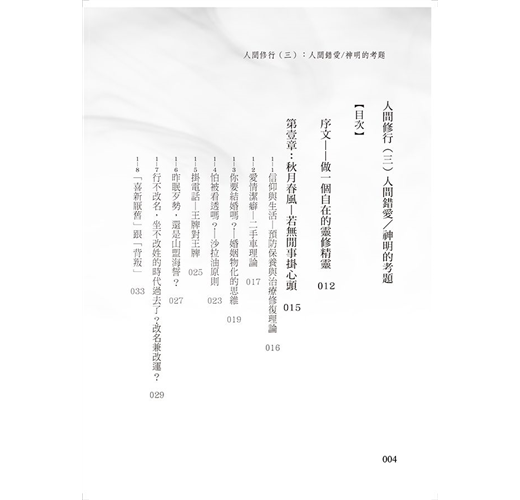 《人間錯愛—神明的考題》本書是人間修行系列3,主要是將人身心的苦惱如何帶入喜悅的修行過程記錄,人生的歷練是神尊的試題,是考驗也是幫助你觀念提升的最好課程。