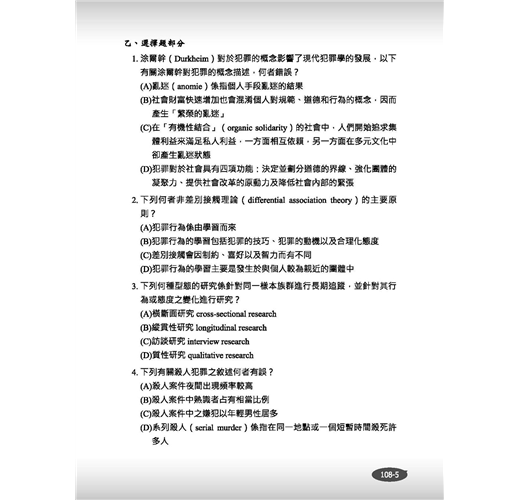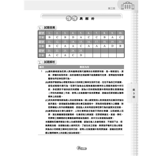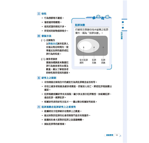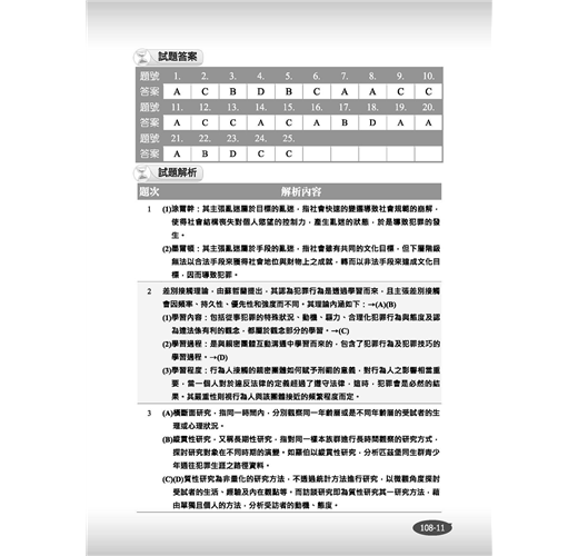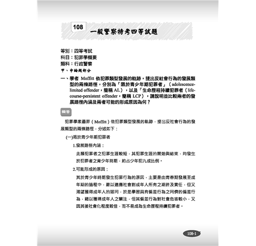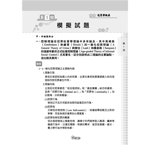 【本書適用】這本《犯罪學概要》適用於一般警察四等考試(行政警察人員) 無法釐清各種犯罪學理論間的差異嗎? 對於不同的犯罪類型,不曉得該怎麼寫出預防對策? 申論題要怎麼寫才會高分?選擇題要怎麼判斷才會準?以上對於百家爭鳴之犯罪學理論不夠通透的問題,三民輔考老師都知道,這本書將帶您解決困惑,取得高分!本書試圖透過重點整理引導,輔以歷屆試題演練的方式,幫讀者排除這些應試障礙。【本書優勢】一、深入淺出本書先以犯罪學基本概念出發,引導熟悉相關重要名詞及基礎觀念後,再進入犯罪學理論命題重點。使用淺顯易懂的文字,教你釐清各家理論要義及差異。其後針對不同的犯罪類型,細說其發生原因、特徵,指引思考,最後總結出犯罪預防對策。縱使沒有犯罪學基礎,研讀此書就能輕鬆駕馭本科目,必能掌握考試致勝關鍵!二、條理分明本書緊扣命題大綱進行章節安排,各章節詳列常考重點,輕鬆掌握研讀方向,再一一剖析理論內涵,完整擊破學習盲點。輔以圖表提醒重要概念,進行跨章節補充,釐清相似或易混淆之內文,通曉整個犯罪學理論,快速抓到得分要領。三、縮點聚焦重大刑事案件常成為犯罪學概要之命題焦點,作者將理論運用於實務,使用考點結合時事出題,以做為每章節精選試題,落實時事脈動與理論之系統性學習,便於檢視自我學習成效,掃除學習盲區。四、齊全完備書末貼心準備107~108年司法特考四等試題、一般警察特考四等試題,由作者精心編寫,題題詳解,讓你面對申論題,解題思路澎湃縱橫,不絕於卷上;面對選擇題,箭箭中鵠。陪伴讀者克服答題障礙!【本次改版修法重點】1.少年事件處理法(108.06.19修正)(1)曝險少年去標籤,縮減司法介入事由虞犯制度以預防少年犯罪為本旨,是我國現行少年司法制度特色之一。惟鑒於虞犯少年並未觸法,相同行為在成年人是不受處罰的,因而本次修正首先改以少年之性格及成長環境、經常往來對象、參與團體、出入場所、生活作息、家庭功能、就學或就業等一切情狀,判斷是否有保障少年健全自我成長之必要者,以補足少年健全成長所需,作為司法介入的正當性原則,去除身分犯之標籤效應。(2)建置曝險少年行政輔導先行機制在112年7月1日之後,曝險少年將由少年輔導委員會,結合各類相關資源,施以適當期間之輔導,如評估確有必要,亦可請求少年法院處理,若行政輔導有效,少年復歸正軌生活,即無庸再以司法介入;因此,新制實施後將以「行政輔導先行,以司法為後盾」的原則,協助曝險少年不離生活常軌,不受危險環境危害。2.刑法(108.12.25修正)以往刑法之罰金以銀元計算,須依刑法施行法第1-1條規定,針對所犯條文計算罰金金額,故本次修法將部分條文之罰金規定,改以新台幣計算,並調高部分條文之罰金上限。【考生上榜心得1】警察特考上榜生:吳沛潾國文:58分英文:76分法學知識:84分刑法概要:73分犯罪學概要:82分警察法規概要:62分由於公職準備科目大部分是求學階段沒有碰觸過的領域,且大多都是法科,剛開始有點吃力,但可能因為是全職考生,所以有比較多時間可以慢慢的細讀每一科,並將相關法科與概念統整起來,方便理解,在考試時能順利運用在解題上。準備的半途中聽聞今年錄取率大幅降低,雖然失落,但所幸最後還是打起精神專心備考,沒有放棄。犯罪學概要我覺得比較難的部分是學派、學者與理論很多,需要大量記憶,可與上課筆記作搭配以便理解,用理解取代死背,會輕鬆很多。【考生上榜心得2】警察特考上榜生:陳韋佐國文:56分英文:64分法學知識:86分刑法概要:78分犯罪學概要:69分警察法規概要:69分目前於大學四年級,面臨即將畢業的就業壓力無所適從,剛好聽說警察特考大招,評估後覺得自己有機會努力一搏。雖然今年招考名額因年金改革因素而與原本預期落差甚鉅,但還是抱持著有念有機會的動力迎接此次的考試。犯罪學概要這科是三個專業科目中可以不用背法條的科目,該科重於理論的理解以及學派演進的流程,有點類似歷史,常出的範圍多落在犯罪社會學派,念法也較著重記憶,理解倒是其次,編個口訣幫助記憶會好念很多,畢竟理論很多還有不同的學者,有些理論內容又長得九成像,剛開始念一定會完全搞不懂到底在念什麼, 我也是大概把課本翻了三、四遍,才漸漸理解,所以就循序漸進吧!