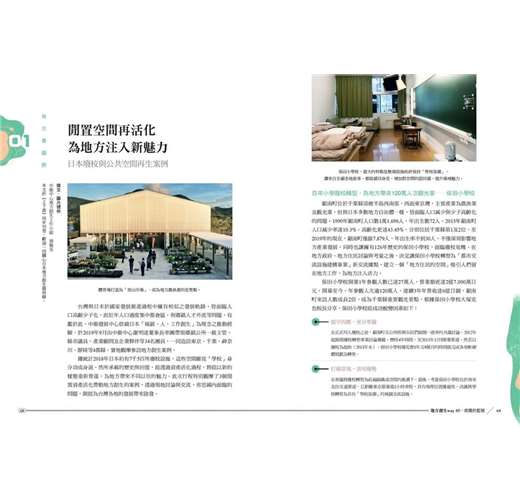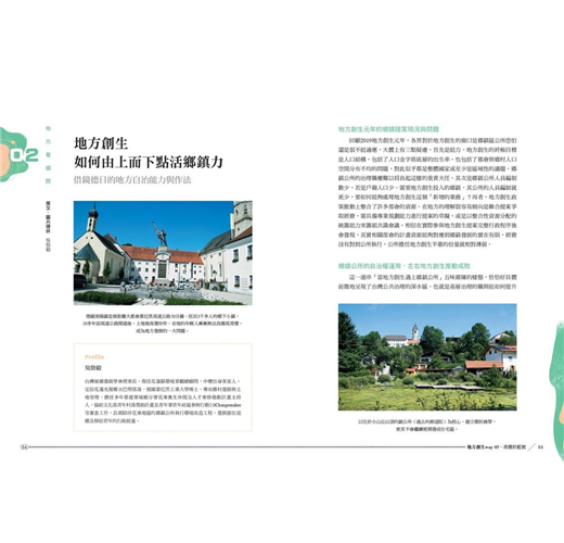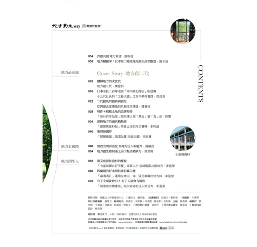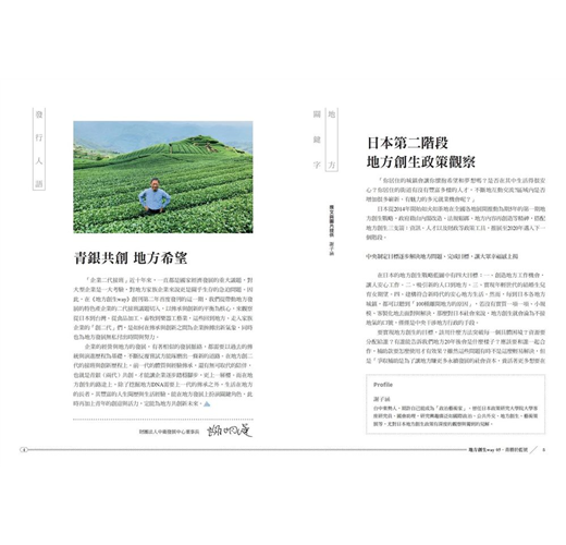 ●「地方最前線」地方想振興、產業要活化、住民從老到小的日常需求要被滿足,人口得以增長,地方才能永續發展,展現蓬勃生機。每期將專題探索創生地方需要的能量、城鄉生態系的發展等多元面向,提供對創生有熱情的公務員、地方產業第二代、地方發展協會團體、創業家,激發更多經營地方的創意、創新思維。