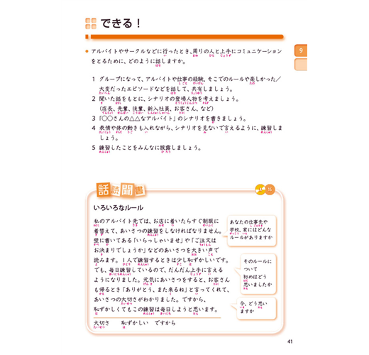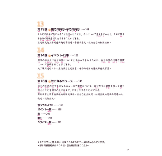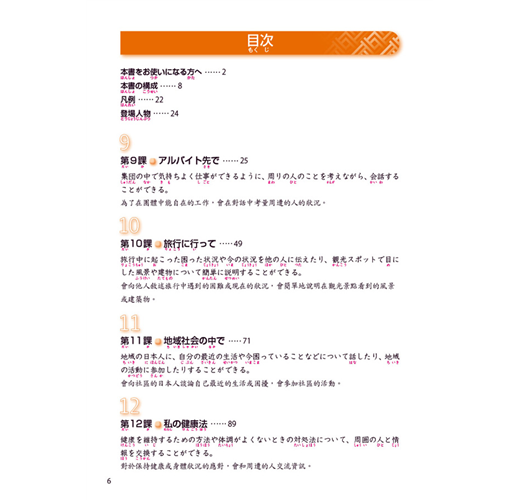 採用「購物」、「生活」、「旅行」、「拜訪」……等貼近生活的內容,並設立明確的課程目標。每課皆設定一個主題,再由3個相關小主題的「說說看」、「聽聽看」、「挑戰!」、「說說看A/B」、「做做看」依序深入練習。透過相似情境把握既有的語言知識,進而吸收新的文法與詞彙。