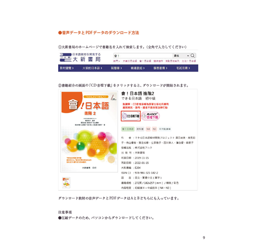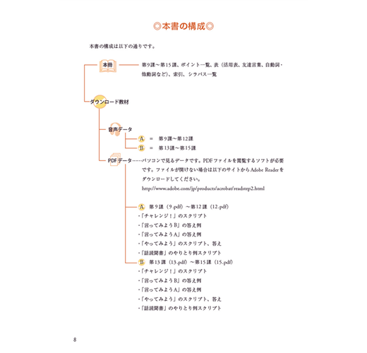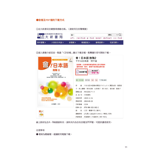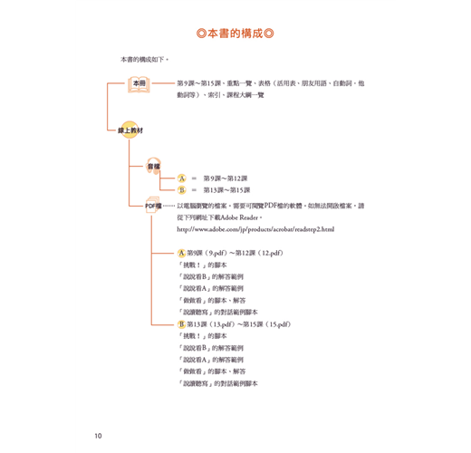 音檔收錄了各課會話範例與腳本,以及「說說看A/B」與「做做看」的解答。有了音檔的輔助,除了學習會話表現與會話流程之外,還能模仿發音及語調出聲練習,必能練就一口漂亮流利的日語。