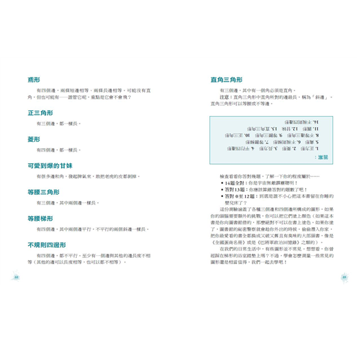 對於數學名詞與觀念的解釋,力求簡單扼要、難度適中,因此中高年級的孩子可以自行閱讀學習,也是老師和家長教學上實用的資料庫與靈感來源。