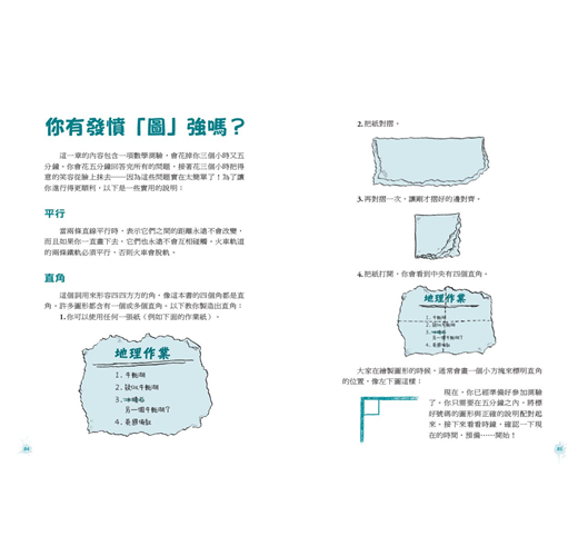作者在編寫本叢書時,一直把握幾個原則:不使用複雜的計算,不使用精巧的儀器,盡量動手做。像書中要證明三角形內角和為180∘,用撕紙的方式就完成了。小讀者們長大後,對於本書所提過的數學名詞應該再也不會心存畏懼了!