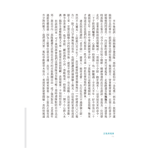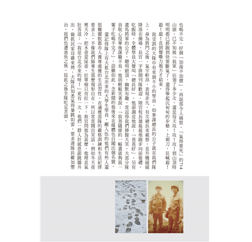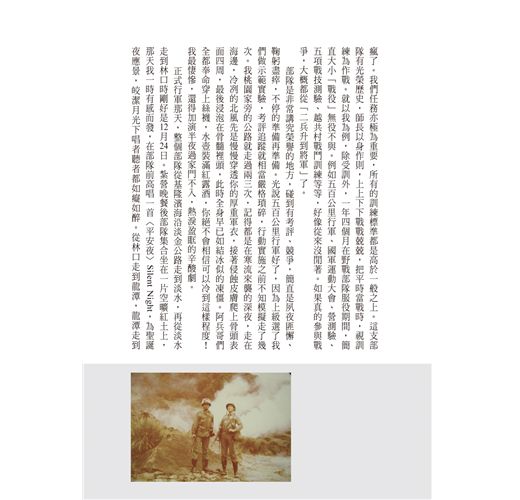 但話說回來,可千萬別誤會我們這個部隊沒有戰力喔!那時連隊駐防在台北近郊,靠近市內,部隊嚴肅生活與近在咫尺的市街熱鬧自由,成了強烈對比,尤其過年過節思鄉最盛。因為上級單位就在旁邊,長官三不五時便來察看,加上旅長正值有高升少將的壓力,我們連只要一風吹草動便草木皆兵,看到黑影便想開槍,真的快被逼瘋了。我們任務亦極為重要,所有的訓練標準都是高於一般之上。這支部隊有光榮歷史,師長以身作則,上上下下戰戰兢兢,把平時當戰時,視訓練為作戰。就以我為例,除受訓外,一年四個月在野戰部隊服役期間,簡直大小「戰役」無役不與。例如五百公里行軍、國軍運動大會、營測驗、五項戰技測驗、越共村戰鬥訓練等等,好像從來沒閒著。如果真的參與戰爭,大概都從「二兵升到將軍」了。