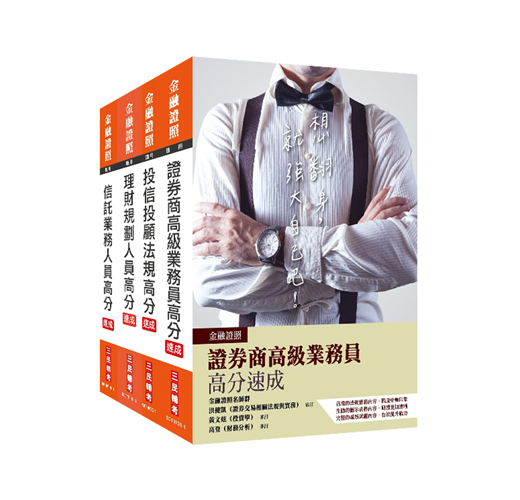 這套《金融證照四合一(證券+投信投顧+理財+信託)限量超值套書》適用於報考「證券商高級業務人員」、「投信投顧業務員」、「信託業務人員」、「理財規劃人員」資格測驗之考生。
