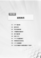 3.操作題型範例題目提供3大類30題,包含「UI設計及語法應用」、「資料儲存、解析與交換」及「服務應用」等,引領學習者藉由UI程式設計熟悉Android的操作,學習取得資料及儲存方法,並強化各項服務管理員之應用,以快速進入Android開放式平台。