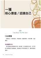 貫穿IMB的核心價值圖,正中央是以自己為本,沒有什麼事比清楚自己的核心價值更重要。中間圈是內在思考的價值觀,能確認自己使命,才會找到自己想要的寶藏,運用顛覆的創新一步步實踐。最外圈是外在表達的傳達方式,明白自己的使命、了解自己的貢獻,確定了需要的寶藏而前去獲得,進而用創新的方向...