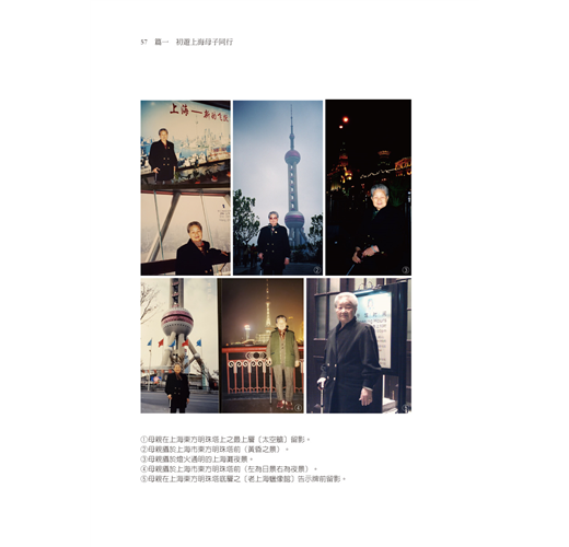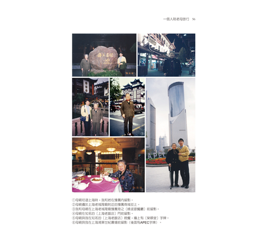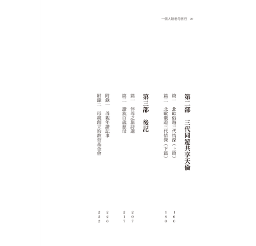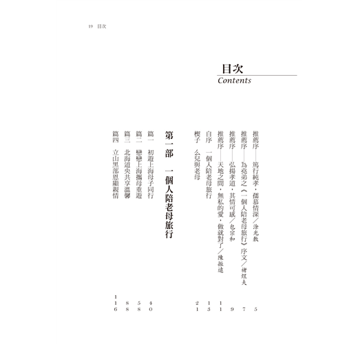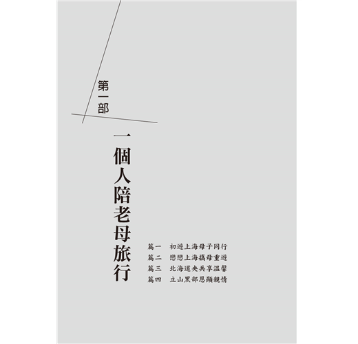 本書分為三大部,第一部「一個人陪老母旅行」,分別從「初遊上海母子同行」、「戀戀上海攜母重遊」、「北海道央共享溫馨」、「立山黑部恩顯親情」等四篇的不同時間與國度,描寫我這輩子一個人帶著老母親出國旅遊的過往情節。