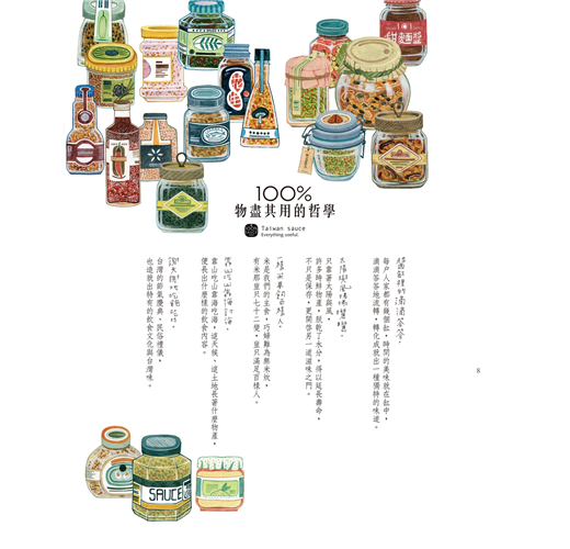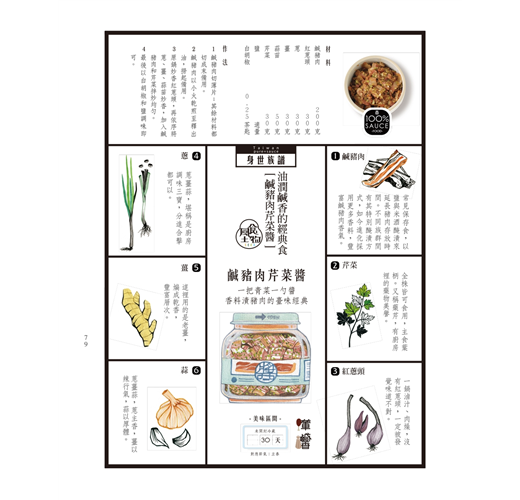 繼銷售好評的《台灣漬》後,種籽設計再次以35個經典代表食材:鹹魚、烏醋、豆豉、豆瓣、酒釀、辣椒紅油、醬油、烏魚子、老菜脯、蝦米、綠豆、花生、鹹豬肉、香菇、豆漿、藥膳、桂圓、鳳梨、魚干、苦茶、蔥蒜韭、紅麴、豆腐乳、菜乾、鹹菜、葡萄、破布子、豬油、青草、麻油、油蔥酥、黑糖、芋仔蕃薯、米酒、老薑釅釀成醬,用醬來觸類旁通,以這料理之魂,帶出更多料理滋味。