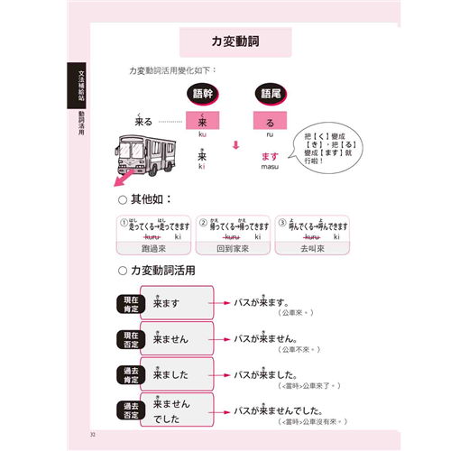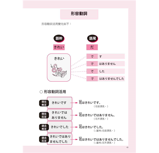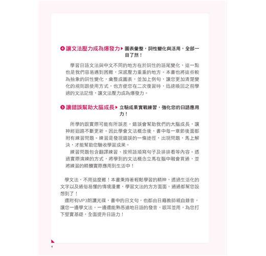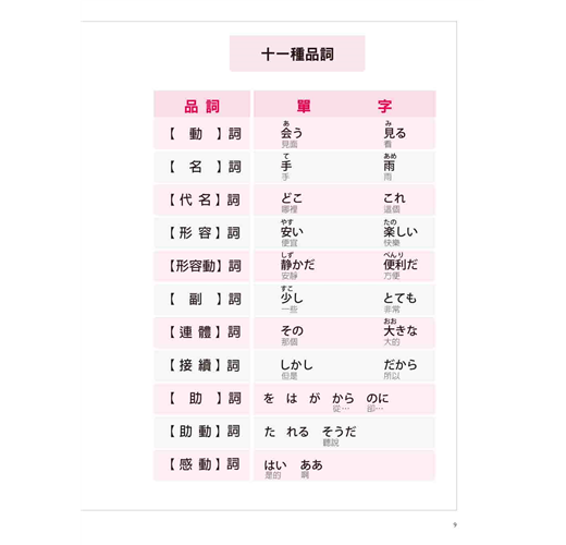 學習日語文法與中文不同的地方在於詞性的語尾變化,這一點也是我們容易遇到困難,深感壓力重重的地方。本書也將這些較為抽象的詞性變化,彙整成圖表,並加上例句,讓您更加清楚變化的規則跟使用方式,也方便您在二次復習時,迅速喚回之前學過的文法記憶,讓文法壓力成為爆發力。