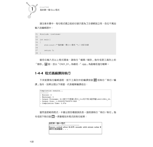 本書結合運算思維與演算法的基本觀念,並以C++ 語言來實作,為了降低讀者的學習障礙,本書範例都是完整的程式碼,以實作來引導觀念,全書程式都已在DEV C++ 5.1.1 的環境下正確編譯與執行。全書寫作風格是以入門者的角度去介紹,除了學習以C++ 語言撰寫程式外,更能加強運算思維及演算邏輯訓練。目前許多高中職學校開設C++ 語言的基礎課程,因此,學生或是初學者都可以使用本書作為進入C++ 語言程式設計的殿堂。
