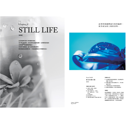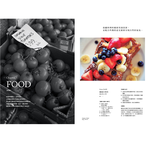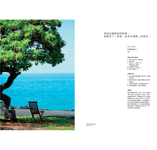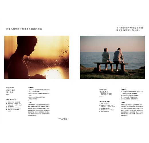 以輕鬆、無壓力的狀態,在宛若食譜書那般的精美版面編排下,跟著野寺老師一同瀏覽100幅美不勝收的攝影作品,學習100個簡單易懂的拍攝絕活,同時間,也讓自己的心,飛到那100種不同的美好情境之中了。