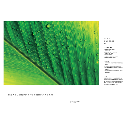 每一張列舉的照片,作者為了讓讀者易於閱讀、方便比較,貼心又細心地依1.題名、2.難度等級、3.資訊+器材+條件、4.拍攝方式、5.重點,整理成條列式說明。解析其內涵如下: