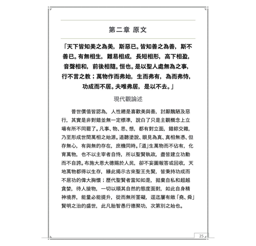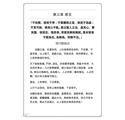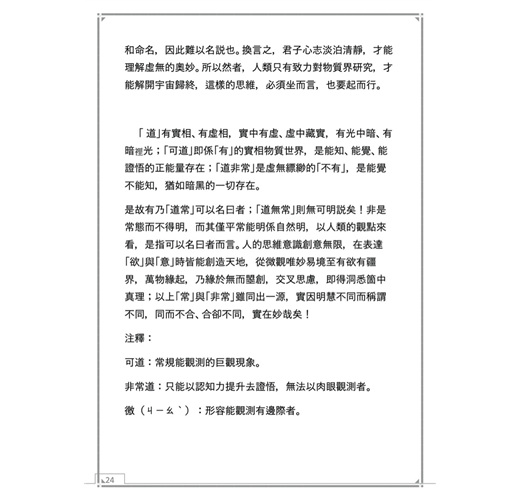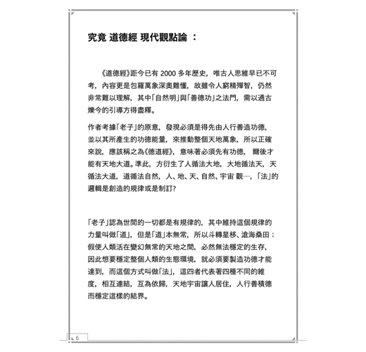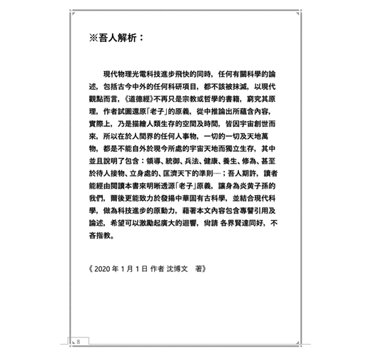 現代物理光電科技進步飛快的同時,任何有關科學的論述,包括古今中外的任何科研項目,都不該被抹滅,以現代觀點而言,《道德經》不再只是宗教或哲學的書籍,作者窮究其原理,試圖還原「老子」的原義,推論出其中內容實際上,乃是描繪人類生存的空間及時間,皆因宇宙創世而來,所以在於人間界的任何人事物,一切的一切及天地萬物,都是不能自外於現今所處的宇宙天地而獨立生存,其中並且說明了包含:領導、統御、兵法、健康、養生、修為、甚至於待人接物、立身處的、匡濟天下的準則……。