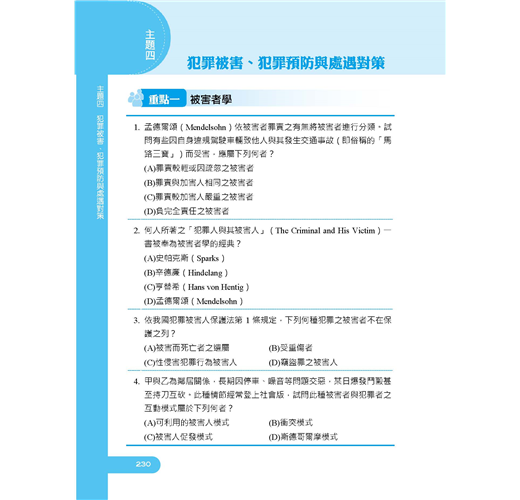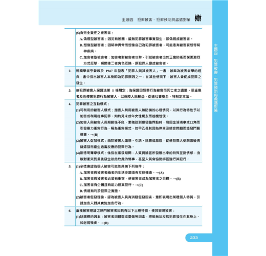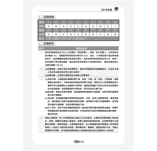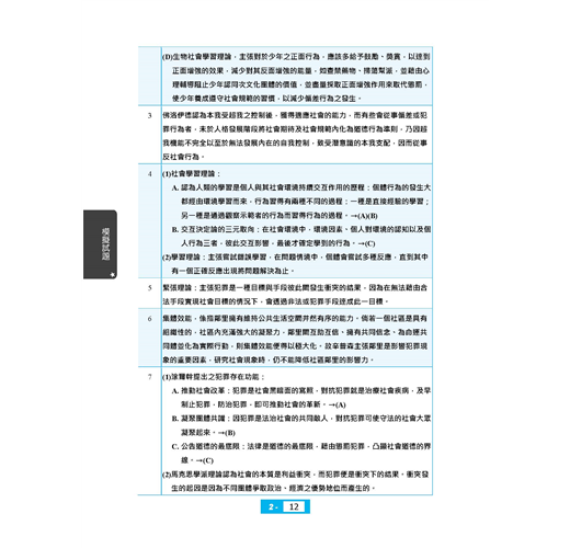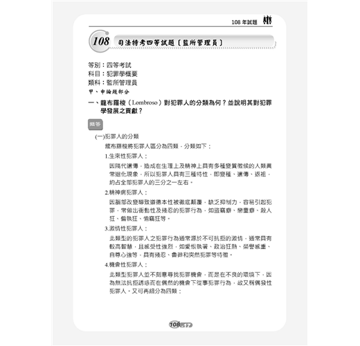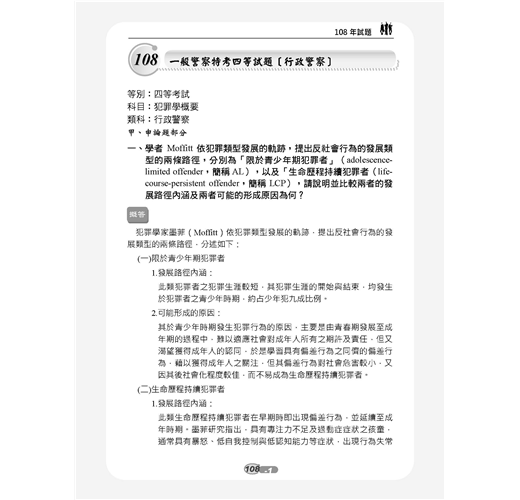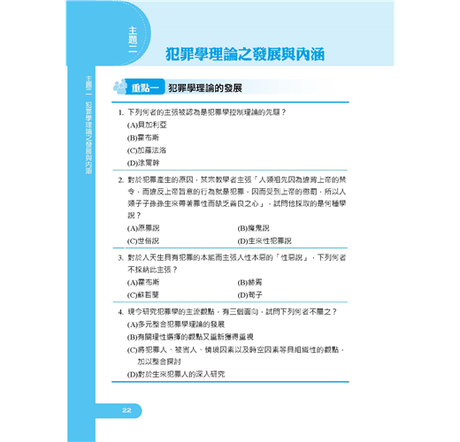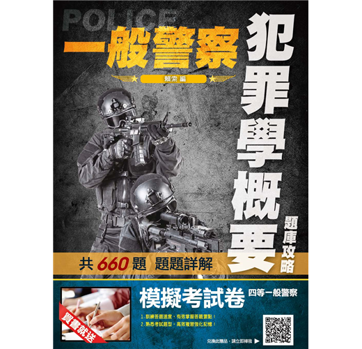 【本書適用】這本《犯罪學概要題庫攻略》適用於一般警察四等考試(行政警察人員)。【考試介紹】109年一般警察特考報名日期為3月10日至19日,考試日期為6月13至14日。懷抱著警察夢的人,即使錯過了警專、警大,只要年滿18歲未滿37歲,具有警察學校以外的高中職以上學歷(無須役畢),也可透過警察考試進入警界。通過警察四等考試,每月實領薪資上看6萬元。民國100年開始招考的「一般警察特考」排除警校體系,僅限一般民眾報考,沒有警校生競爭,加上每年錄取名額多,錄取機率高,是民間人士加入國家警察團隊的最佳管道。一般警察四等考試分為「行政警察、消防警察、水上警察」三大類科。其中行政警察的專業科目為「刑法概要、警察法規概要、犯罪學概要」共三科,皆為申論選擇混合題型。四等行政警察就是一般民眾最常見的派出所警員,職責以較低危險性的外勤工作為主,包括派出所值班、備勤、戶口訪查、交通指揮、酒駕欄檢、臨檢、巡邏等。在一般警察四等考試三大類科中,行政警察的特色就是每年開缺很多,特別適合具有法律背景,對第一線基層警察工作有熱忱的青年報考。準備行政警察考試同時,再多讀「監獄學概要、監獄行刑法概要」2科也可一併攻略8月筆試的司法四等監所管理員考試,增加上榜機會。【本書優勢】.犯罪學理論與處遇對策那麼多,哪些最常考?.申論題要怎麼寫才會高分?選擇題要怎麼判斷才會準?以上關於考生對《犯罪學概要》這科所面臨的問題,三民輔考老師都知道,本書將帶您解決困惑,取得高分!一、依歷年試題分析撰寫(一)本書第一部分主題式分類試題:依犯罪學概要歷年常考試題分為「基本概念、犯罪學理論之發展與內涵、犯罪類型與預防對策、犯罪被害、犯罪預防與處遇對策」四大主題共24個重點,幫助考生有架構地練習。主題題目愈多表示愈常被命題,讀者可立即知悉被頻繁命題的考點,題感會越練越強。(二)第二部分模擬試題:附有三回試題,做為考生演練的木人樁,可立即演練增強實力,與實際上場做最緊密的連結。(三)第三部分最新試題詳解:收錄107~108年一般警察人員四等考試、司法特考四等監所管理員試題,題題詳解,將理論陷阱與細節一一揭露。過去的考古題往往成為來年命題委員出題的基本素材,要想掌握本科考情趨勢者,務必須勤加演練!二、660精華題,題題詳解本書由三民專業名師精心編輯,主題分類試題+模擬試題+歷屆試題,總題數達660題。題題詳解。作者欲憑此書,讓讀者面對選擇題,箭箭中鵠;面對申論題,解題思路澎湃縱橫,不絕於卷上。掌握最新命題動態,必能掌握考試致勝關鍵!三、先題目再解析本書排版方式為「題目在前、解析在後」,讀者練習時不用擔心看到答案,縱使有難題也不用怕,本書題題詳解的解析可供演練後進行自我檢討。輕鬆辨識曾經做錯的題目再次挑戰,充分掌握每一題的分數。【考生上榜心得】一般行政警察上榜生:陳韋佐國文:56分英文:64分法學知識:86分刑法概要:78分犯罪學概要:69分警察法規概要:69分目前於大學四年級,面臨即將畢業的就業壓力無所適從,剛好聽說警察特考大招,評估後覺得自己有機會努力一搏。雖然今年招考名額因年金改革因素而與原本預期落差甚鉅,但還是抱持著有念有機會的動力迎接此次的考試。分享各科準備方法如下:【國文】此科目因為範圍太廣,我認為投資報酬率低,故我只選擇背了公文格式就上考場。【英文】此科我只有偶爾背單字,然後寫考古題。如同大家所說的高中7000單字,背過一遍應該可以拿到不錯成績。【法學知識】憲法部分一定要把握住,分數比起法緒來說好拿太多,憲法本文及增修條文看熟後就是掌握釋字,我是從考古題中掌握常出的釋字,畢竟700多快800號不太可能有時間慢慢看,所以我選擇從考古下手比較快。法緒部分因為涉及太多法律,準備時也是相當繁雜,其中包括刑法該科為警察專業科目,分數一定要要求自己全拿,民法因為體系過於龐大,只能大致了解了各章的重點,不建議單純法條瀏覽,從第一條到最後一條太浪費時間也沒效率,建議直接看課本做考古然後檢討,若有搞不懂但也問過老師,終究就是學不會的題目的話,就先略過不要太拘泥,在那兩三分先掌握大方向比較重要,至於其他相關特別法如家暴、勞基、性平、公司、健保……諸如此類,因為法條太多了,所以我也是從考古題下手看完課本練考古題,盡量掌握較常出的部分。畢竟法緒範圍太多了,共才出25題,相較之下憲法好準備許多。【犯罪學概要】這科是三個專業科目中可以不用背法條的科目,該科重於理論的理解以及學派演進的流程,有點類似歷史,常出的範圍多落在犯罪社會學派,念法也較著重記憶,理解倒是其次,編個口訣幫助記憶會好念很多,畢竟理論很多還有不同的學者,有些理論內容又長得九成像,剛開始念一定會完全搞不懂到底在念什麼,我也是大概把課本翻了3、4遍,才漸漸理解,所以就循序漸進吧!【刑法概要】多數人覺得最難準備的科目之一,當初因為對刑法挺有興趣的,所以看函授的過程中並不會覺得有太多枯燥的部分,準備方式是先念完總則的相關條文及理論,當然此時也會連結到分則的條文,就一起對照著看順便記憶背誦,其中錯誤的部分應該是最繁雜的地方要好好搞懂,再來分則主要就是理解及背誦法條構成要件,法條我是只背了歷年來相關重要條文