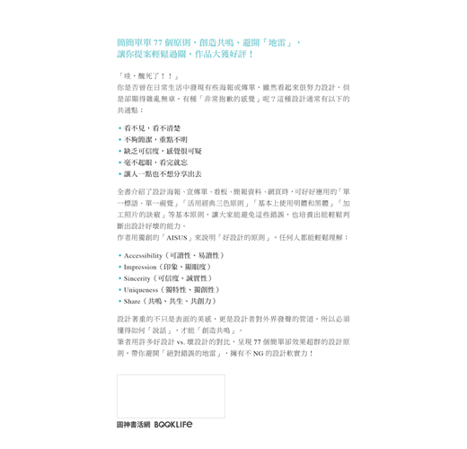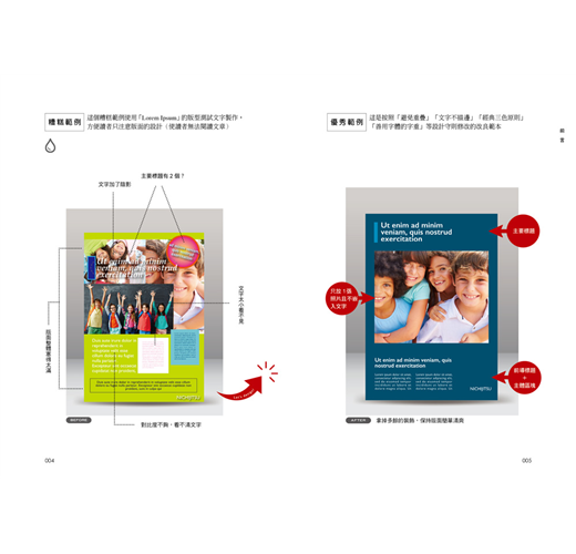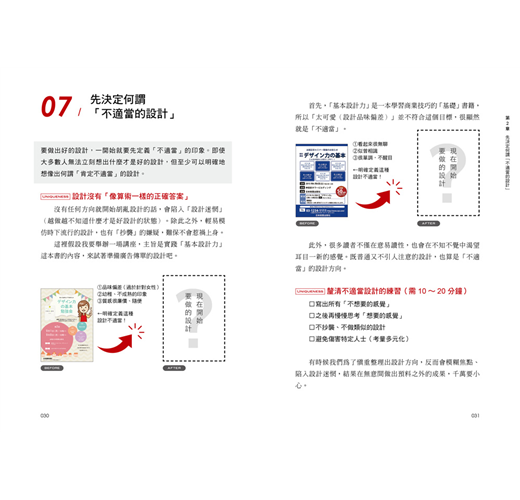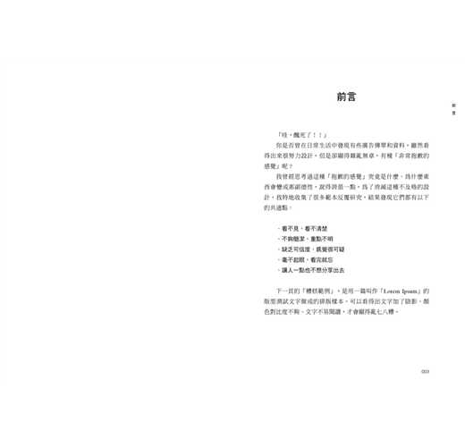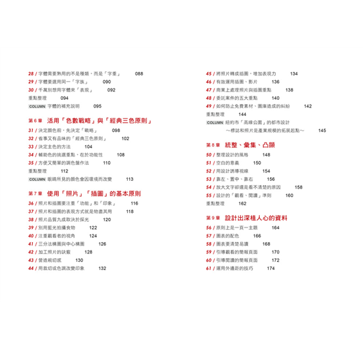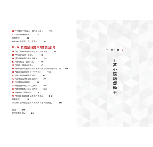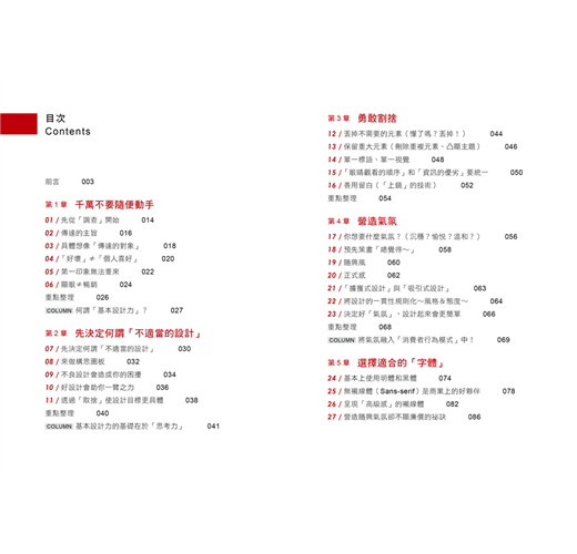 全書介紹了設計海報、宣傳單、看板、簡報資料、網頁時,可好好應用的「單一標語、單一視覺」「活用經典三色原則」「基本上使用明體和黑體」「加工照片的訣竅」等基本原則,讓大家能避免這些錯誤,也培養出能輕鬆判斷出設計好壞的能力。