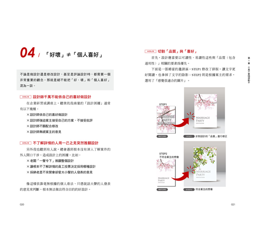 要素中的哪一種,或是涵蓋全部的效果,帶領讀者逐一解決設計上常見的疑難雜症。同時透過全部共77 道課題,徹底學會「AISUS」這五大要素。