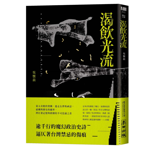 《渴飲光流》,作為吳懷晨的第二本詩集,延續了《浪人吟》的筆鋒和語調,同樣流盪著迷人的閱讀氛圍;不同的的是,這次他選擇的主題大步跨入一段幽暗的時間長廊,他以白色恐怖統治下受傷的生命、不屈的靈魂為對象,勾描令人驚心動魄的史事,批判不義與強權對人的存在與尊嚴的踐踏,交織在神話、魔幻和現實的多重映照之中,展現了意象繽紛而又色調清晰、音聲雜揉而又主調突出的史詩格局。