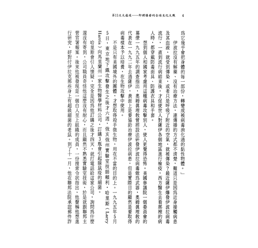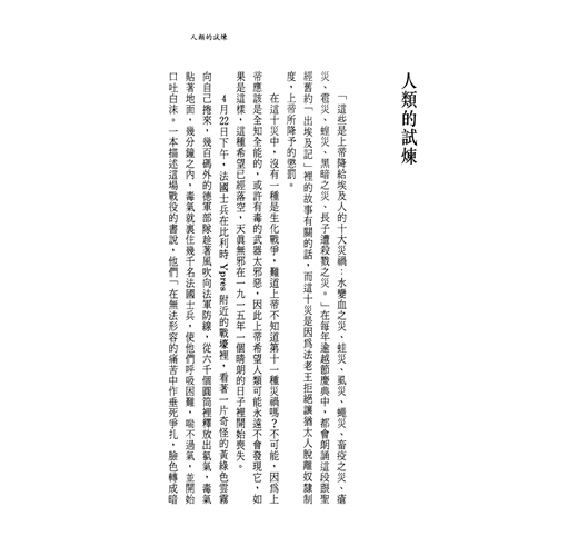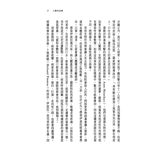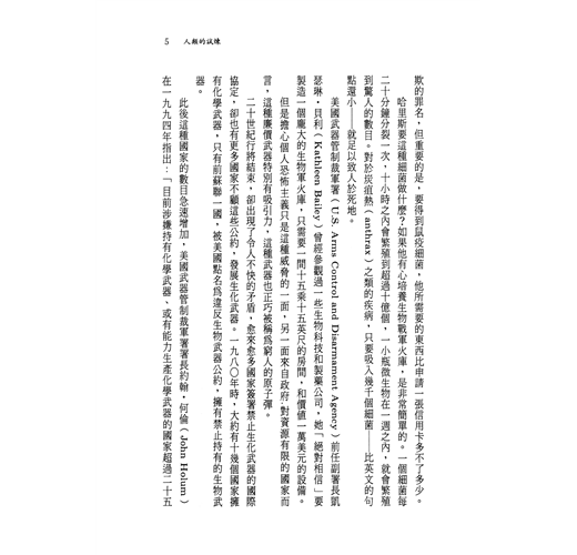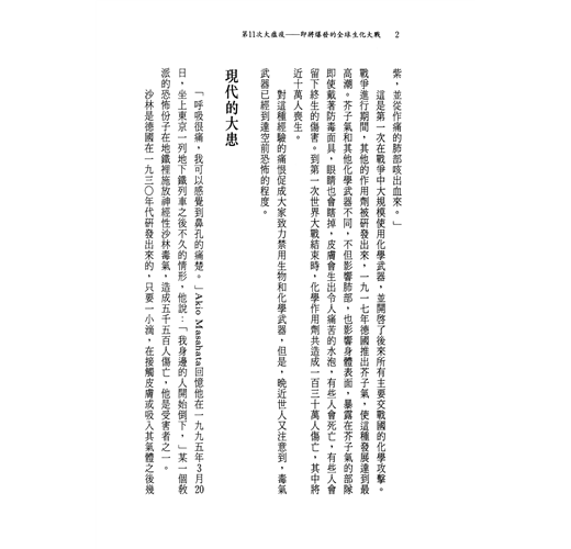 本書作者寇爾是美國發展恐怖醫學領域的先驅,也是醫學院的恐怖醫學與安全計劃創始主任。他使用歷史和當代實例來舉證,首先是在一九一五年一個晴朗的日子裡,德軍利用地勢及風向對幾千名法國士兵釋放出氯氣,使他們呼吸困難,喘不過氣,並開始口吐白沬,並從作痛的肺部咳出血來。一九一七年德軍再度推出芥子氣化學攻擊戰,使得這種罔顧道德的武器發展達到最高潮,截至第一次世界大戰結束時,化學作用劑共造成一百三十萬人傷亡,其中將近十萬人喪生。伊拉克也在八○年代使用化學武器對付伊朗和庫特族人,並於一九九一年波斯灣戰爭中,再度以生化武器威脅多國部隊備。一九九五年奧姆真理教的恐怖份子在東京地鐵裡施放神經性沙林毒氣,更造成五千五百人傷亡……