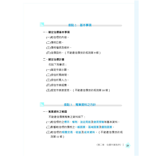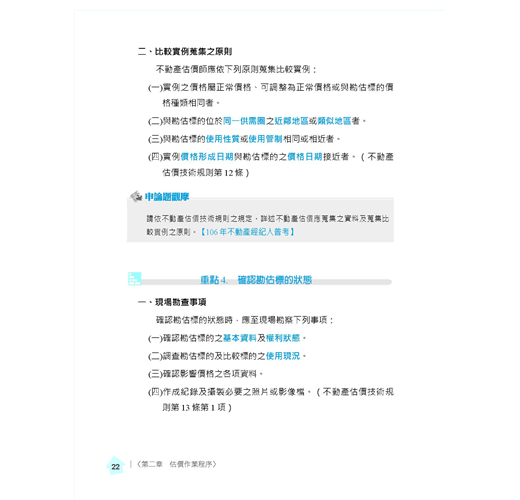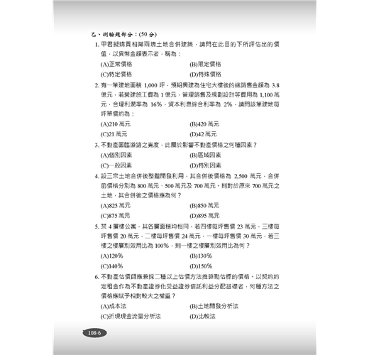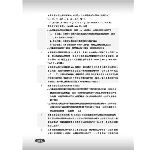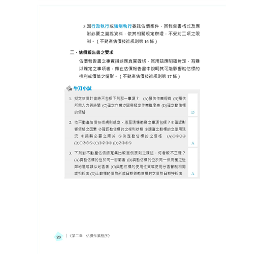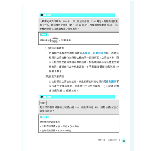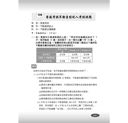 【本書適用】這本《不動產估價概要》適用於專門職業及技術人員普通考試不動產經紀人考試。【考試簡介】不動產經紀人考試不限科系,只要高中(職)畢業即可報考,採及格制度沒有錄取人數限制,只要總成績達60分就合格,加上考試內容不算困難,證照入手後每月約可多4~8千元薪資,算是高CP值的證照。且不動產業多數職缺不受學歷背景限制,房仲業也樂於聘用各學經歷背景的人才,因此不動產從業人員取得證照來證明自己的專業性,在博得客戶信賴方面尤為必要。【本書優勢】.估價基礎概念背了很多,但看到題目卻總是套用錯誤?.考場作答腦內一片空白無法思考?擬答順序顛倒錯亂?.遇到計算題直接想放棄?使用何種估價方法搞不清楚?以上對於艱澀的不動產估價概要內容理解不夠通透的問題,三民輔考老師都知道,這本書將帶您解決困惑,取得高分!本書試圖透過重點整理引導,輔以歷屆試題演練的方式,幫讀者排除這些應試障礙。一、條理分明本書先以重要概念奠立基礎,讀者心中先有大致框架,再一一梳理法規脈絡,完整擊破學習盲點。本書緊扣命題大綱進行章節安排,並以圖表輔助學習,釐清相似或易混淆概念。尤其本科非常著重繁瑣的技術性規定與基礎概念,平時就要穩扎穩打、費心記憶才能高分。本書將大量文字圖像化,讓讀者有效利用大腦的記憶體。每章最末附有牛刀小試精選試題,讀者閱讀完一章後可立即用來檢視自己理解了多少。二、靈活運用不動產估價概要並非僅靠單純法規背誦即可搞定,非屬法規的三大估價方法亦為命題重心。計算題在申論題或選擇題皆有可能出現。為了解決讀者解題困擾,本書內文附有經典案例,每題皆有詳細解題步驟,利於理解。只要能明確區辨各公式之使用時機,取得高分絕非難事。再搭配本社出版的《不動產經紀人搶分小法典》,條文後題目愈多表示愈常被命題,讀者可立即知悉被頻繁命題的考點,將記憶力花在刀口上。三、齊全完備作者精研歷年不動產估價概要考古題,將考點相同的題目分列於書中內文相對應之段落,協助考生更具體的理解各主題過往命題焦點,便於考生檢視自我學習成效,從中釐清命題動態。書末幫考生貼心準備96~108年專門職業及技術人員普通考試不動產經紀人考試試題,題題詳解。讓讀者在申論題答題井然有序、層次分明,理論概念與計算題型兼顧,完美擬答一揮而就。面臨選擇題也能當機立斷,不為摸稜兩可的錯誤選項所惑!四、彰顯關鍵本書採雙色印刷,答題關鍵字以藍色標記,利用黑白藍三種色調,進行系統性學習。多一種顏色,多一道區隔,考點經由統整後,必能在讀者腦海中更見清晰。【三民考生上榜心得1】不動產經紀人榜眼:邱婷鈺國文:66分民法概要:63分不動產估價概要:82分不動產經紀相關法規概要:87.5分土地法與土地相關稅法概要:85.5分本身是地理學士、國外都市規劃碩士畢業,工作接觸的客戶主要來自政府部門,一段時間發現都市規劃在政府部門較有發展性,但由於沒有要往公職發展,最後考慮興趣及產業性質決定考不動產經紀人證照,除了作為自己轉職門檻之外,也希望藉此機會補足對國內法規上的認識不足。其實剛開始備考時壓力很小,是一直到考前2、3個月時,才開始對讀書進度緊張起來,壓力就隨之排山倒海而來,還好馬上調整自己,趕上讀書進度。但有些科目的相關條文真的不太好背、很容易忘記,我知道這沒有什麼捷徑,除了上課聽三民輔考老師仔細講解外,在寫考古題時,忘了就是翻書、複習,一次比一次忘得少,就算有進步了。分享各科準備方法:【土地法及土地相關稅法概要】土地法相關法規準備起來非常費時。三民老師將土地法相關法規轉換成體系表呈現,而不只是單純的背誦而已。土地稅相關法規方面,概念及計算都很重要,常會出現在選擇題。三民謝萬華老師萃取考科菁華,讓考生於短時間內快速掌握考點,本科準備上跟著三民老師的腳步就對了。【不動產估價概要】不動產估價概法規不到150條,是所有科目中準備起來最划算的。就算沒有什麼時間,這科一定不能放棄。三民老師會先將本科重點講解給同學了解,再策略性地教同學如何準備。計算並不難,但前提是要有觀念基礎才知道怎麼算。【不動產經紀相關法規概要】不動產經紀相關法規主要有四個法規,近年來常有修法,當年度需特別注意修法重點。這科要記憶的也很多,建議結合生活經驗來記,此科選擇題相對比較直觀,但由於申論題可發揮的空間很大,因此要拿高分不容易,需花一些時間設計答題內容,盡量越豐富越好。【民法概要】民法的條文內容非常可觀,其中以債編及物權編最難但也是重要考點。民法三民老師一樣會將條文重點整合成體系表,常於課堂上結合有趣的,或是生活上常見的例子做說明。因民法的繼承編及親屬編條文數量相對少、考點明確、與日常生活息息相關,準備起來報酬率相對高,建議不要放棄。【國文】因準備專業科目花了不少時間,國文除了吃學生時代的老本外,平常有機會就多閱讀培養些語感,包括文章架構及各種表現方法等,有什麼方法就都儘量用上,避免文章讀起來語言無味、言之無物。【三民考生上榜心得2】不動產經紀人上榜生:蕭韞真國文:59分民法概要:83分不動產估價概要:88分不動產經紀相關法規概要:82分土地法與土地相關稅法概要:89分大學念的是國際企業管理學系,畢業