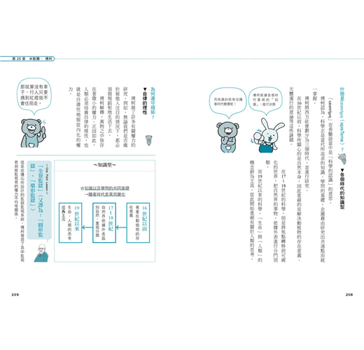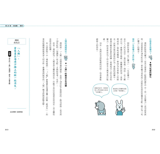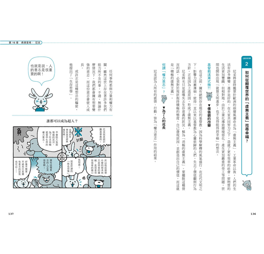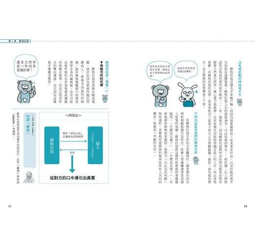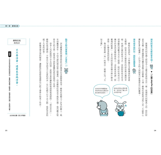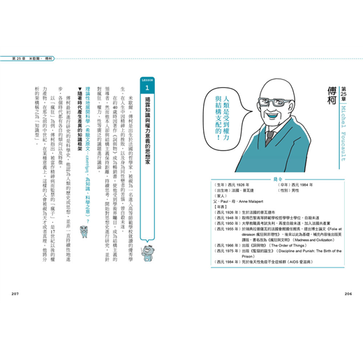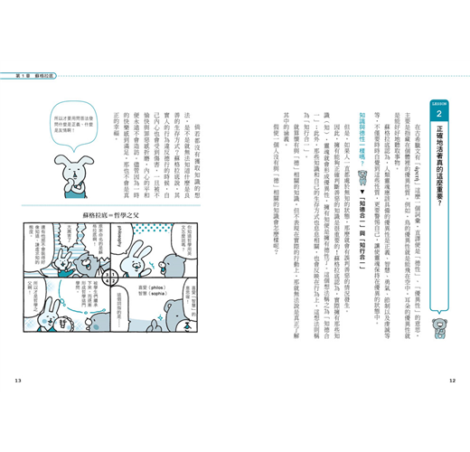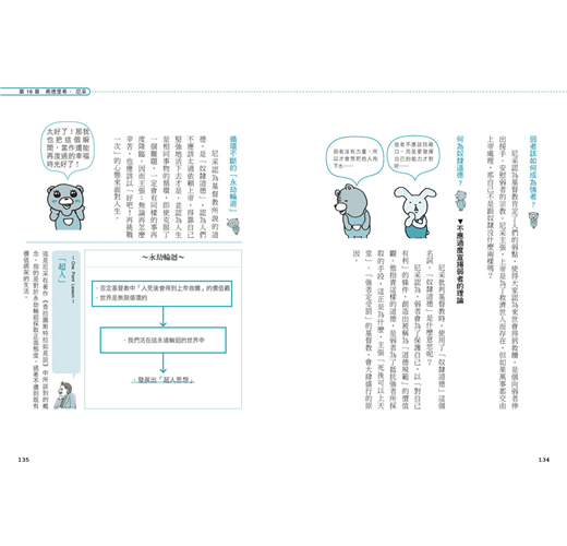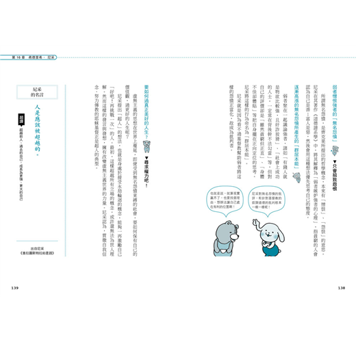 【特色3】縮短哲學與你的距離,用「最輕鬆有趣」的漫畫穿插講解!特別搭配手繪風的「哲學家頭像插畫」,讓人可以一窺大師神韻風采;並穿插活潑的「四格漫畫」,在本書三位「動物引路人」的帶領下,輕鬆搞懂哲學大師的深奧思想,化繁為簡,在不經意間就掌握人生哲理、看透萬物本質,進而變成自己的信仰理念,可以自在地去面對每一天的生活!