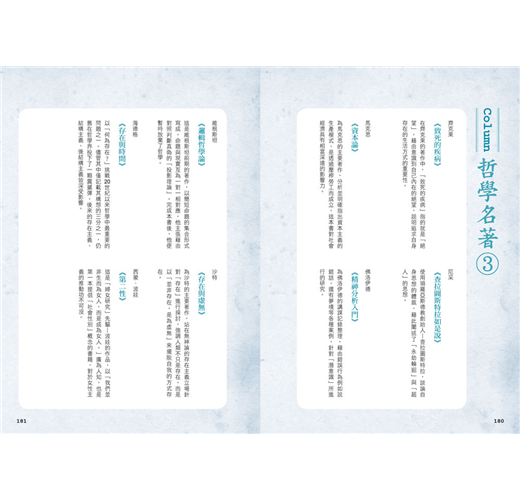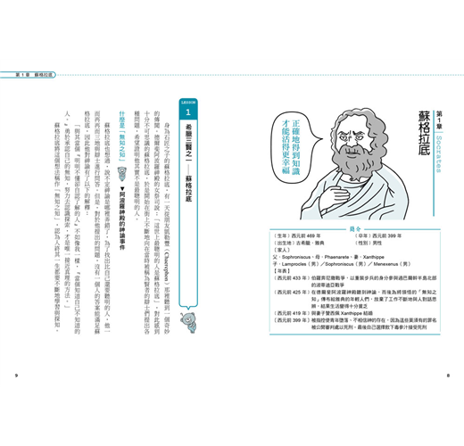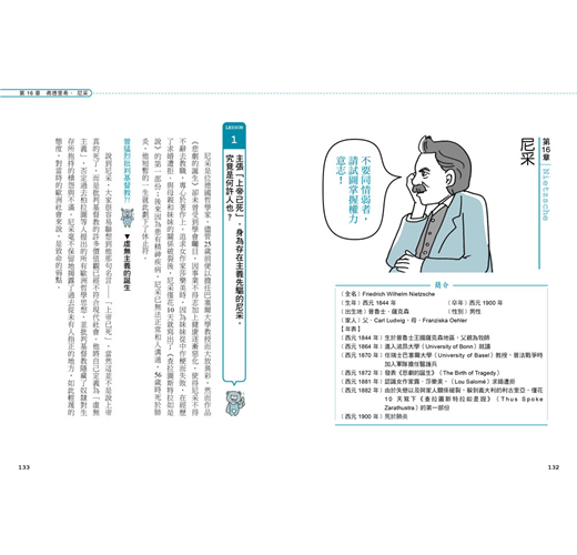 【特色2】中學生也能輕鬆入門,以「最容易上手」的方式進行編排!全書依照年代時序列出「哲學家」姓名,再以專欄型式提綱挈領、簡明概述「重要生平」事蹟;接著採用淺白文字直搗「思想理論」核心;最後再點出其「經典名言」及「重要著作」。綱舉目張,讀來絲毫不費力——深入30位哲學大師的世界,真的好過癮!