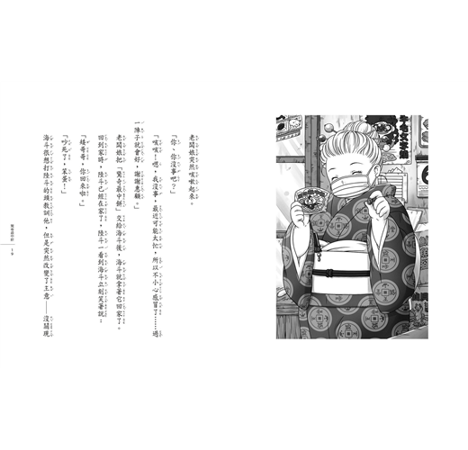 她的身材真的很高大。因為海斗很矮,所以必須把整個脖子向後仰,用力抬頭才能看到她。她穿了一件古錢幣圖案的紫紅色和服,一頭白髮上插著五顏六色的髮簪,看起來氣勢十足。但是她戴了一個白色大口罩,所以海斗看不到她的臉。