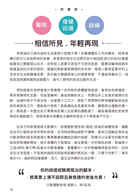 推薦序- 1. 黃啟煌 國立體育大學 前副校長/教務長 2. 鄭雲龍 脊椎保健達人 作者序- 相信所見,年輕再現 緒論- 高齡社會與健康老化 -游曉微 科學化運動總量擊退高齡疾病 -吳旻寰 使用說明 PARTⅠ-在信的人,凡事都能 Ⅰ-1雙腳走遍全世界 -郭建中醫師 Ⅰ-2不開刀就蹲下去 -邱宇倫運動物理治療師 Ⅰ-3從太極活出自我 -吳孟恬運動治療師 Ⅰ-4骨盆底肌拯救我 -徐緯珍綻放瑜珈創辦人 Ⅰ-5生命活得有尊嚴 -蔡奇儒特殊族群專業訓練機構創辦人 Ⅰ-6 中年補鈣要留心 -周寒中西醫臨床醫學健康管理師 PART Ⅱ-揪出卡卡在哪裡? Ⅱ-1.PAR-Q+ 評估表 Ⅱ-2.靜態評估 正面觀 / 背面與側面觀 Ⅱ-2動態評估 標準深蹲動態評估 動態姿勢評估 進階-過頭深蹲評估 動態姿勢評估 退階-靠牆深蹲評估 PART Ⅲ- 科學實證訓練法 Ⅲ-1.太好了! 運動連腦力和免疫力都提升 Ⅲ-2.原來啊! 平時舒服坐姿是溫柔慢性殺手 Ⅲ-3.怕跌倒?! 用健走杖帶你上山下海的旅遊-郭健中 Ⅲ-4.真的嗎?! 矯正好姿勢,脖子自然就放鬆-劉育銓 Ⅲ-5.動起來! 做真正的核心取代柺杖與護腰-徐緯珍 PART IV – 關鍵性運動恢復 [睡好覺]從筋膜球進行放鬆肩頸開始 [好伸展]矯正肩頸後,站姿好看痠痛消失 [別緊張] 先評估再對症訓練,有效解決疼痛 [不卡卡]放鬆髖關節,讓你順利蹲廁所 [好舒壓]小腿消腫脹,不只有靠牆抬腿 [好放鬆]健走慢跑族的髂脛束放鬆法 PART V-你的故事 未完待續 後記:找到你的健康節奏 / 周寒 高年級上流生活 / 林冠廷 你的故事集