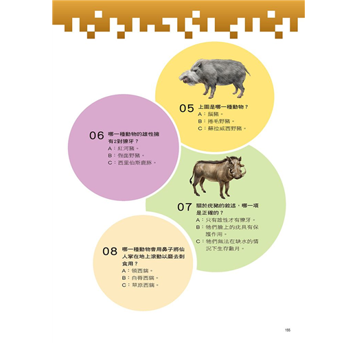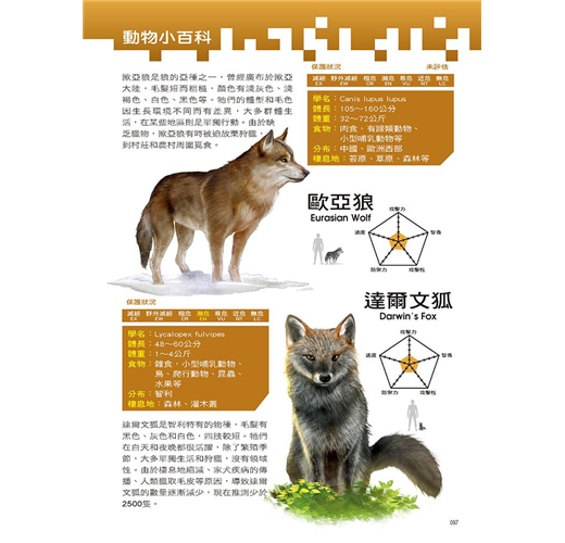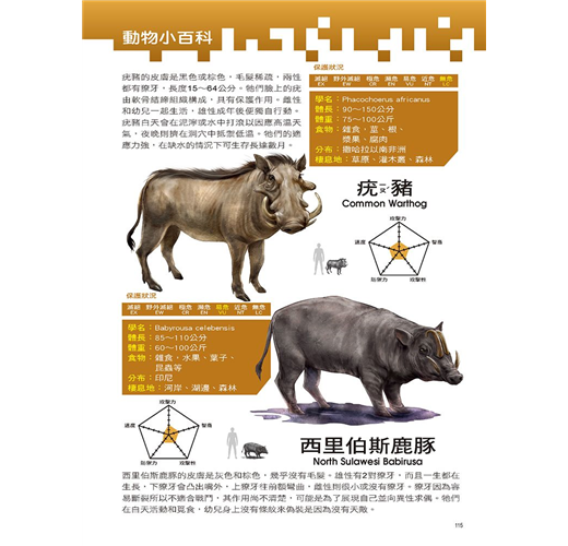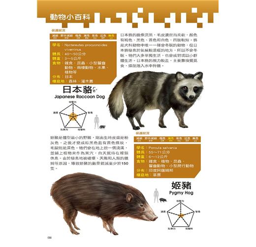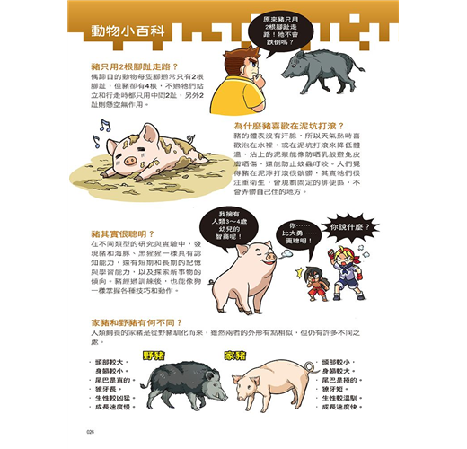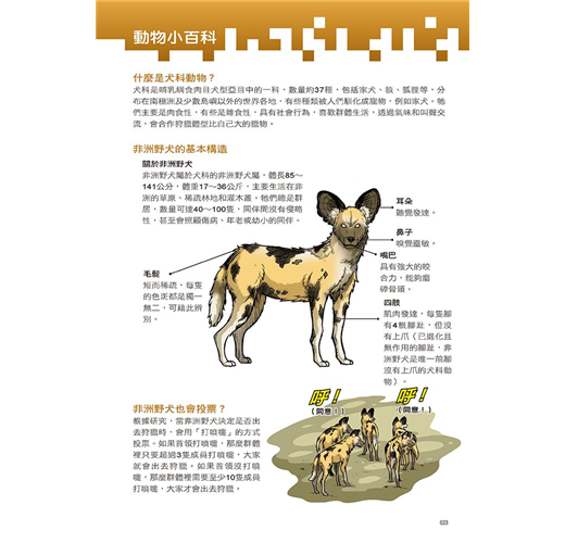設有「動物小百科」單元,特別介紹犬科動物和豬科動物的構造與小常識,以及大耳狐、苔原狼、日本貉、疣豬、西里伯斯鹿豚、白脣西貒等動物的超炫常識,讓小朋友有系統的學習。