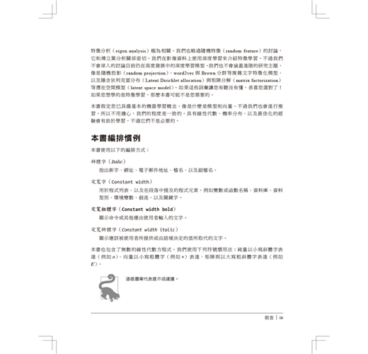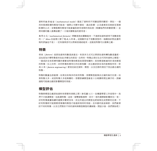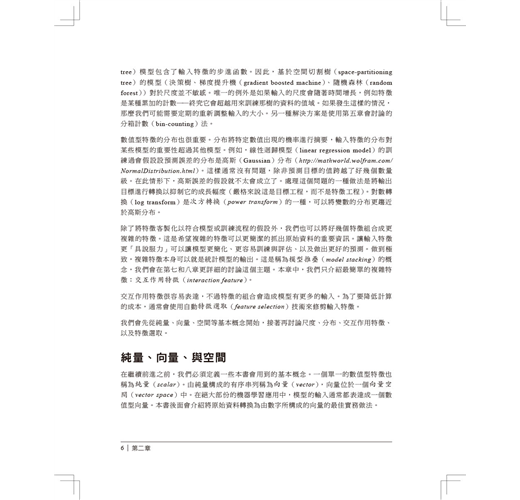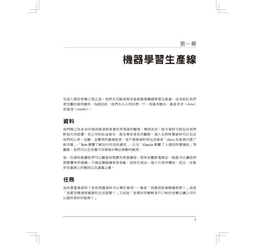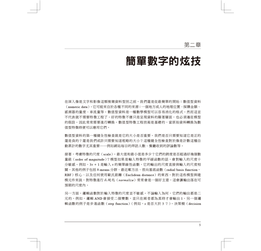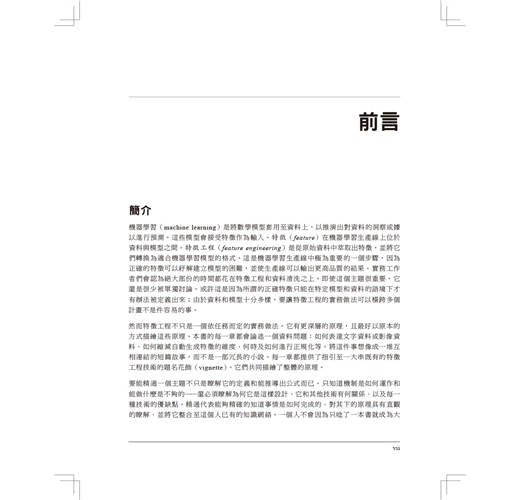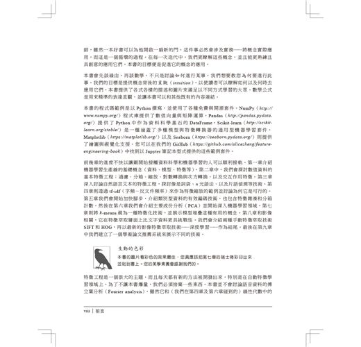 不是只教導這些原理,作者Alice Zheng和Amanda Casari也在整本書中使用習題來聚焦在實際應用上。最後一章會藉由在一個真實的結構化資料集上應用數種特徵工程技術來總結全書所學。程式碼範例則使用了Python的套件,包括numpy、Pandas、scikit-learn、以及Matplotlib。