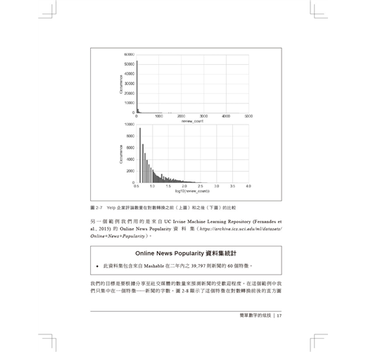 ‧數值資料的特徵工程:過濾、分箱、縮放、對數轉換及次方轉換