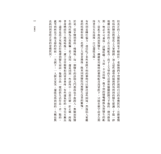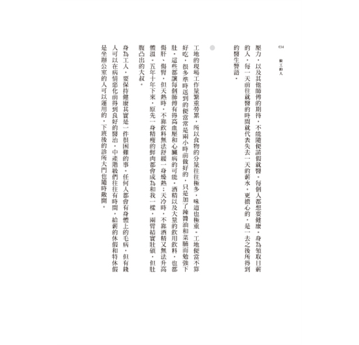 如何在各式工種的本位主義間協商,各留餘裕的可能?還要面對勞雇間的矛盾拉鋸,監工本身必然也有極富張力的故事。不過,立青沒選擇在這個角色多著墨,轉而把焦點放在他所接觸的工人生命樣貌。我猜想,這樣的書寫態度很可能也如實反映了他與工人們的關係:讓監察的角色退一點,讓學習的態度多一點,承認並看重師傅的生命經驗。我們只有在散落的篇章中,浮光掠影地察覺他身為監工的內在矛盾,或是不得不陷入「在施工進度和工人安危下掙扎求生」,或是在法令與人性的擠壓下,終至做出「我永遠不會配合警察辦案抓外勞」的決定。唯有在〈虧檳榔〉一文中,總算看見這名年輕監工在工地裡流轉、虛耗、等待、跑腿的碌碌身形,與同樣年輕的檳榔西施們相濡以沫的安慰、放鬆,看不到盡頭的失落。