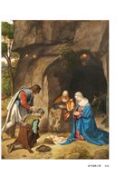 柔和的光線,為人物憑添幾分溫情,怪石嶙峋的背景造成陰影,強化了天意的神祕氣氛。他放棄了被教會界約定俗成表現神聖的頭頂光環,改以洞穴外洩進的光源,象徵著神聖。