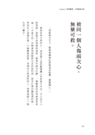 五十五篇的悔過書,寫滿割捨、和解與彌補,不希望我們只是同病相憐,而是能在情感的泥沼中相互拉拔,有故事也有應對方法,由內而外的關係修復,重塑一個更完整的自己。人際的守恆定律,是當一個人不再依賴著任何關係,於湍急的世事中昂然挺立,不因誰而脆弱,唯有做到這般成熟才不致於飄搖。你的世界,你才是軸心。