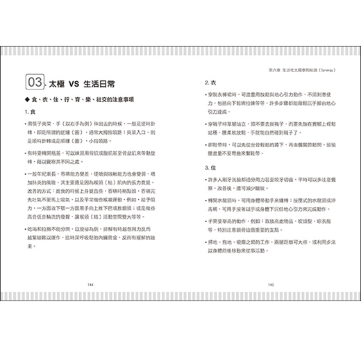 ◎具體傳授太極如何影響平時行為舉止及落實在生活作息中。