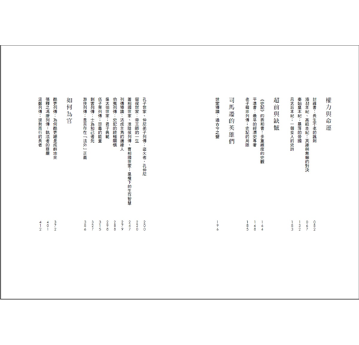 最後則從列傳中選出幾篇今天讀來仍具備高度思想衝擊的個傳與集傳,讓讀者體會一下司馬遷碰觸、揭露跨時空的普遍人間議題的高超能力。