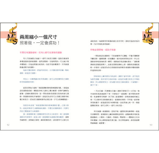 ‧本書內容是她過去十年鍛鍊肌肉瘦身經驗的濃縮版,除了介紹有效的肌力運動,也公開她個人的養生減重菜單,可說是雙管齊下的「肌力訓練縮小尺寸瘦身法」。