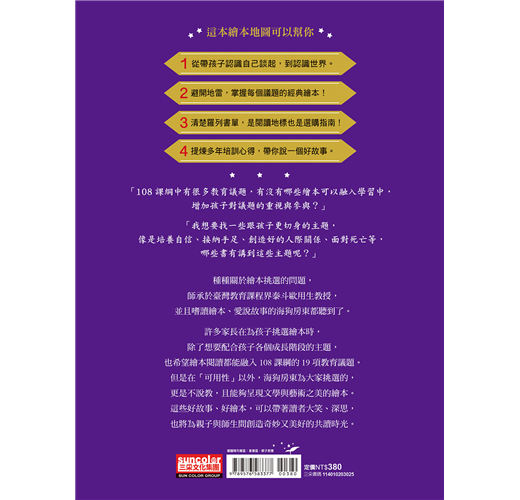 這本書取名為《繪本教養地圖》,地圖不同於路線圖或行程表,旅人拿著地圖只是為了找到參照的位置或有興趣的去處,書裡選出的繪本像是地圖上標示的景點。與孩子共同成長的旅途上,你們可以自由安排行程,決定適合的速度和深度,也可以另外開發私房的景點。因此,在「孩子的世界」與「世界的孩子」這兩個大方向之下的十一個小主題,並沒有所謂的「閱讀的順序」,或是照書教養的步驟,你可以依據自己與孩子當下的感覺和興趣,決定順序與步調,甚至增列更多屬於你們私心喜歡的書單。